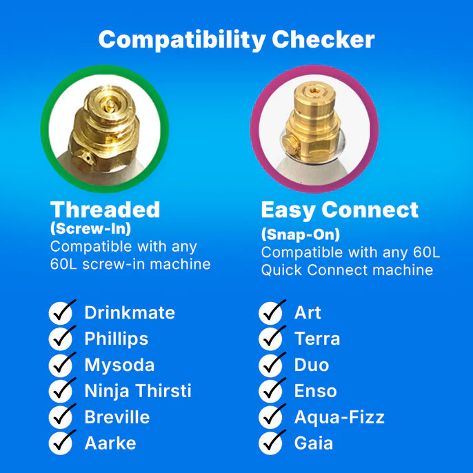 Sodastream machine models such as Gaia, Terra, Art use Quick Connect CO2 Cylinders, and all other machines (Drinkmate/Aarke etc) use standard screw in cylinders. Please refer to our compatibility checker.
